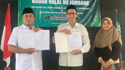Sebagai informasi, Launching Badan Halal NU dan Komunitas Juru Sembelih Halal Nahdliyin Jombang di Aula Kantor PCNU Jombang, dihadiri antara lain Wakil Ketua PCNU Jombang KH Kamal Reza, serta Sekretaris PCNU Jombang KH Ubaidillah.