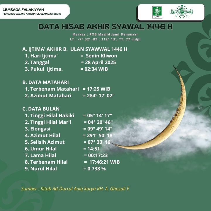 hilal akhir Syawal 1446 H atau bertepatan dengan Senin Kliwon, 28 April 2025 M adalah 4 derajat 20 menit 46 detik dengan elongasi 09 derajat 49 menit 14 detik dan lama hilal di atas ufuk 17 menit 23 detik.
