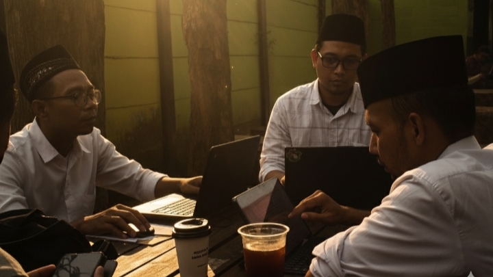 Ketiganya, dengan mengenakan kemeja putih dan peci hitam, duduk melingkar di sekeliling laptop yang menampilkan tumpukan naskah. Wajah mereka menyiratkan ketelitian dan konsentrasi tinggi.